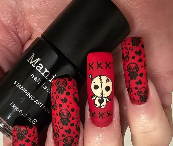 Matte red nails stamped with black voodoo dolls and one standout stitched doll design, giving off a gothic, spellbound look.