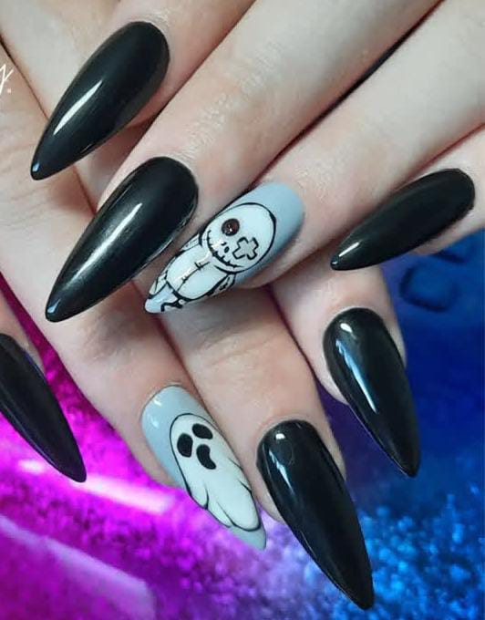 Sleek black stiletto nails paired with ghostly grey accents and a stitched voodoo doll, blending spooky elegance with haunting details.