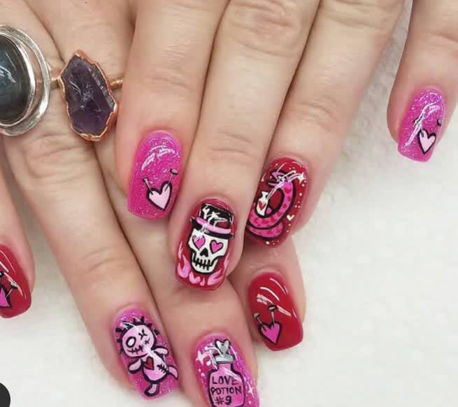 Bright pink and red nails featuring hearts, potions, skull, snake and a stitched doll, mixing voodoo magic with a fun, romantic twist.