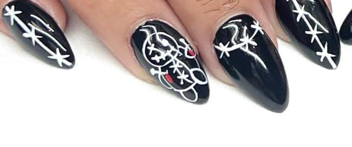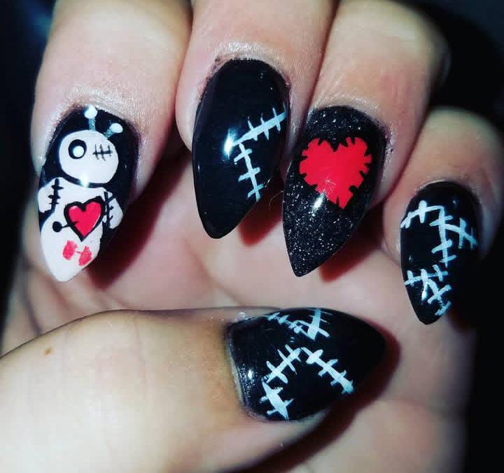 Black-toned nails with stitched red hearts and stitched voodoo doll faces channel a gothic, haunting energy.