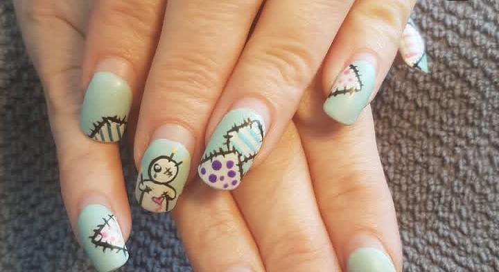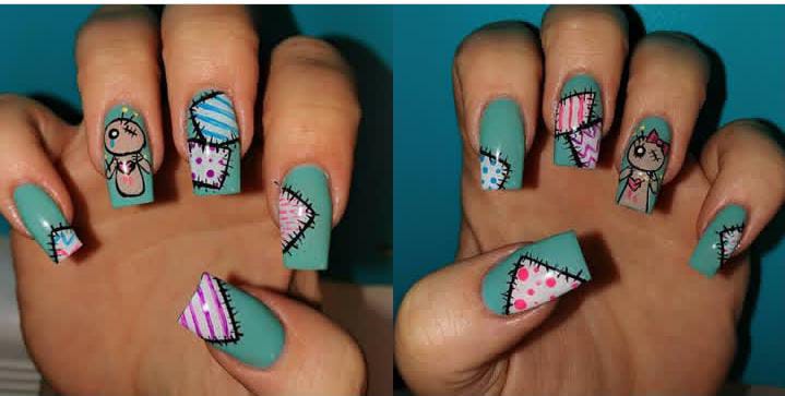 Turquoise nails with colorful stitched patches and cute voodoo doll details, playful yet spooky.