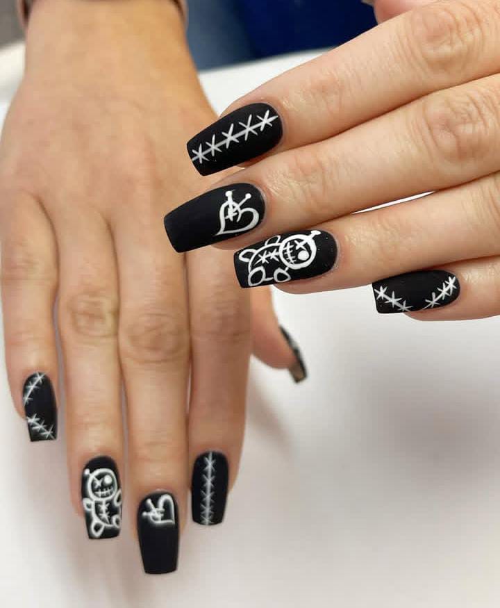 Matte black nails decorated with white stitched lines and voodoo doll art, dark and mysterious.