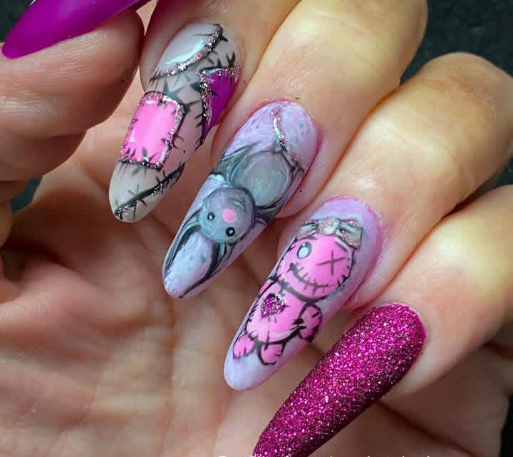 Pink and gray nails with glitter accents and hand-painted stitched voodoo dolls, mixing creepy with cute.