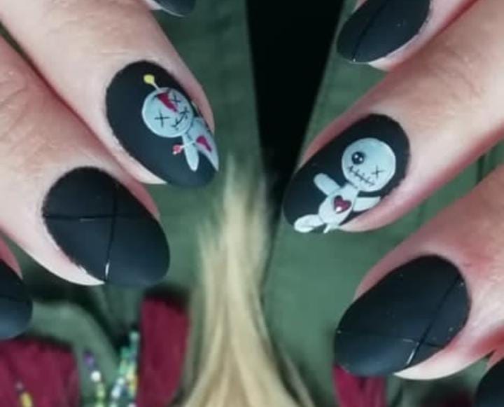 Matte black nails with stitched details and creepy-cute voodoo doll art give a bold, gothic vibe.