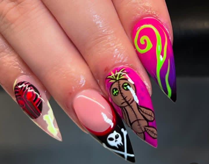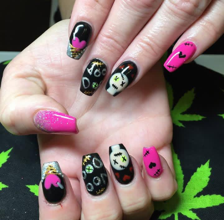Black and hot pink nails with glowing voodoo doll faces, stitched hearts, and bright accents for a dramatic, edgy style.