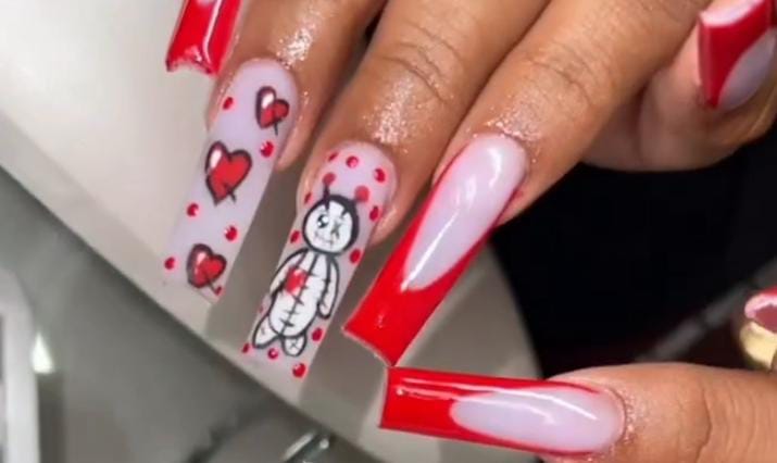 Glossy red and nude nails featuring heart motifs and a stitched voodoo doll design make for a striking, love-meets-dark-magic look.