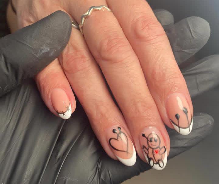 Soft nude and white nails decorated with fine black line art of hearts and a playful voodoo doll, adding a cute yet mystical touch.