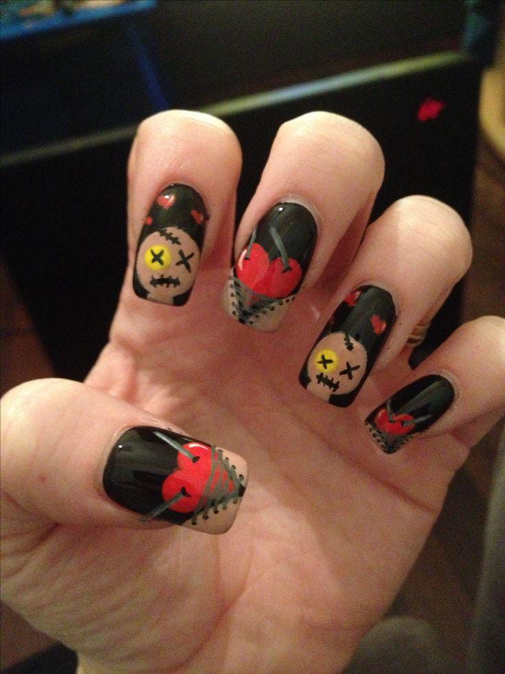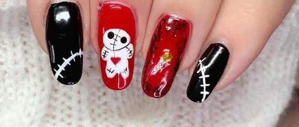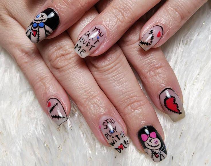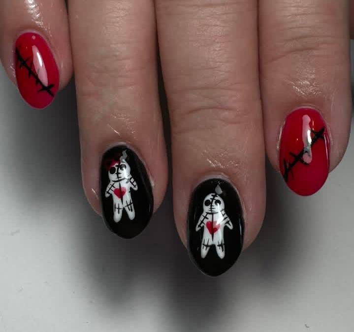 Black and red nails feature stitched patterns and creepy white voodoo doll figures with heart accents for a spooky effect.