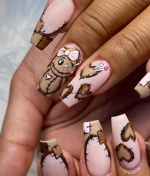 Soft nude-pink nails decorated with stitched hearts and a stitched voodoo doll with a bow, blending eerie with cute.