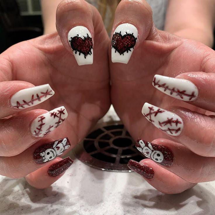 Bold white nails with red glitter hearts and stitched patterns give a dark, voodoo art, edgy broken-love vibe.