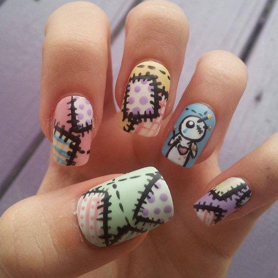 Soft pastel shades with patchwork stitches create a playful yet slightly spooky voodoo doll-inspired look.