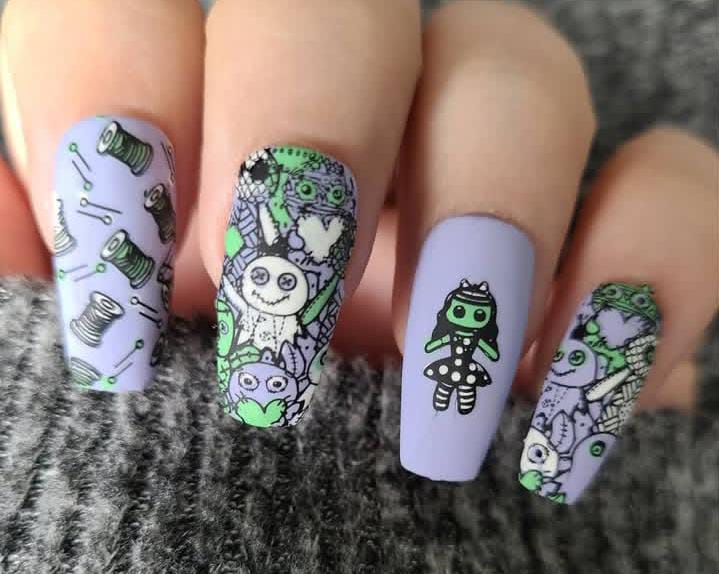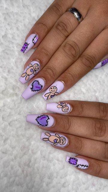 Light purple nails decorated with stitched hearts and voodoo doll designs strike a balance between cute and eerie.