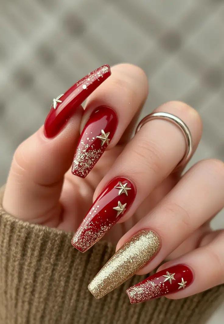 Deep red nails dusted with gold glitter and topped with metallic star charms, paired with a full gold-glitter nail, create a warm, festive Christmas, winter look.