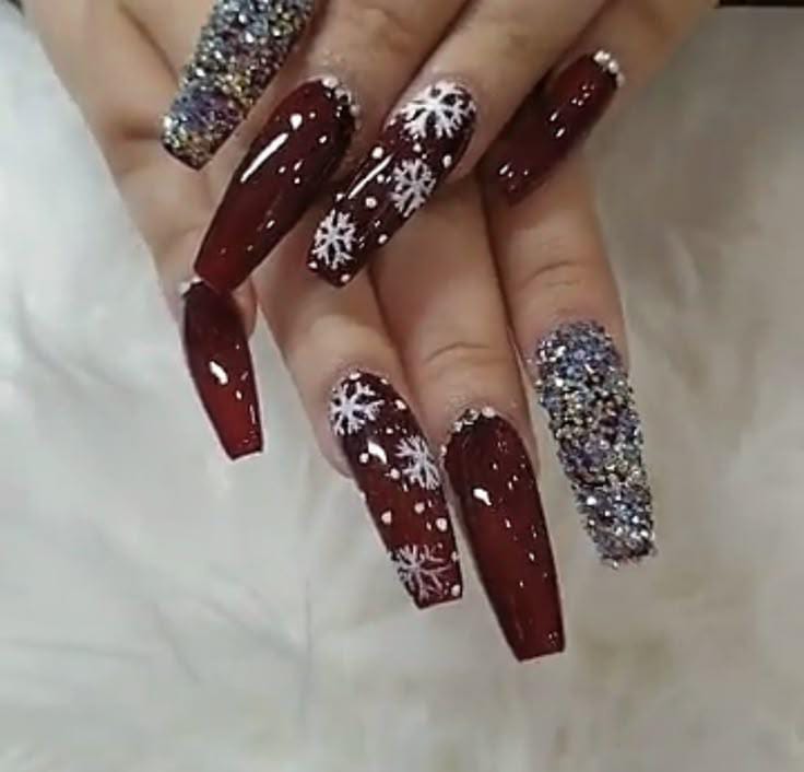 Deep wine-red nails paired with sparkling silver glitter accents and white snowflakes for a rich, festive winter look.