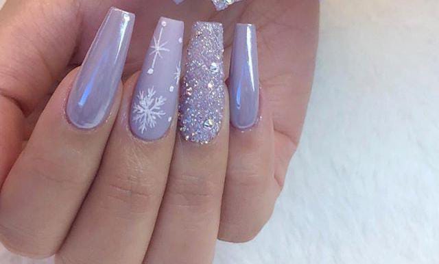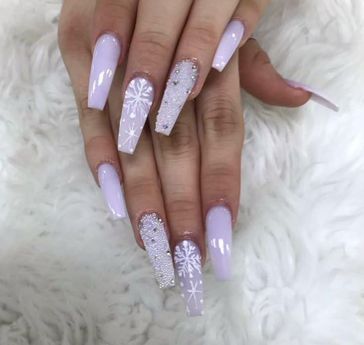 Soft lilac tones with a pearly sheen, complemented by glittery accent nails and dainty white snowflakes for a frosty, elegant winter feel.