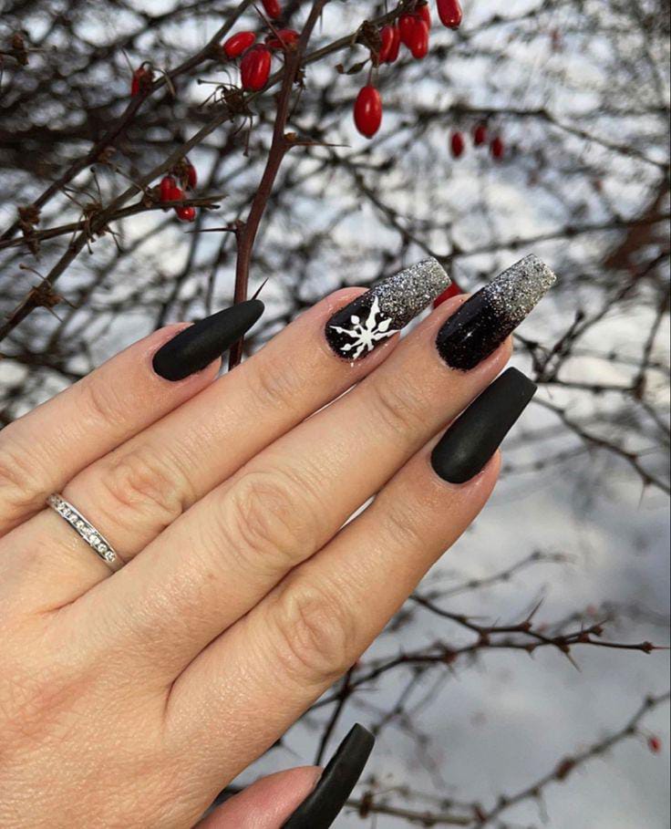 Matte black nails mixed with silver glitter and a bold white snowflake design, creating a dramatic, winter-night aesthetic.