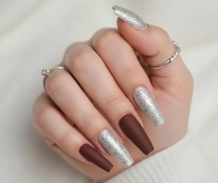 This set pairs rich matte brown coffin nails with bright silver glitter accents for a bold but classy winter contrast. The mix of warm and icy tones gives it a cozy-meets-festive vibe.