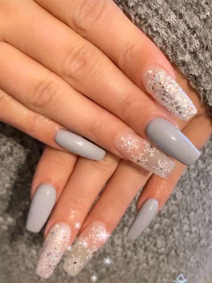 Cool grey nails mix with silver glitter accents and subtle white snowflakes, creating a soft, wintry look that feels both cozy and frosty.