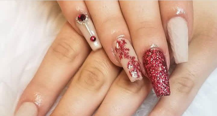 Nude nails are dressed up with red glitter, tiny gems, and delicate red snowflake patterns for a winter holiday-ready look. It’s soft, sparkly, and perfect for anyone wanting a touch of red.