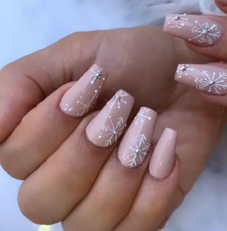 A smooth nude base is topped with minimal white snowflakes and tiny gem centers, giving the design a delicate, airy, and softly glamorous winter feel.