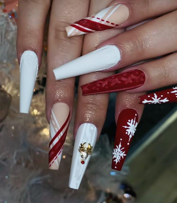 A bold blend of deep red and crisp white creates a festive holiday feel, with candy-cane stripes, knit patterns, snowflakes, and a tiny reindeer charm adding playful winter energy.
