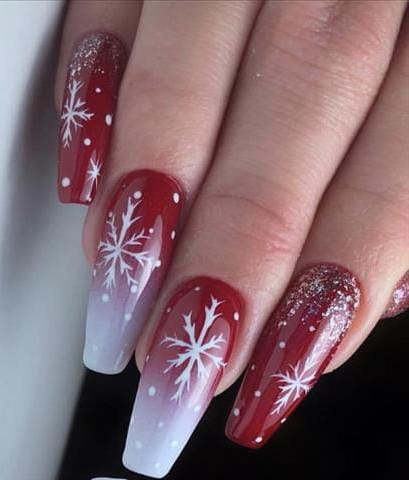 A bold red ombre coffin set decorated with delicate white snowflakes creates a festive, wintry look that feels both elegant and striking. Light glitter adds a soft frosted finish.