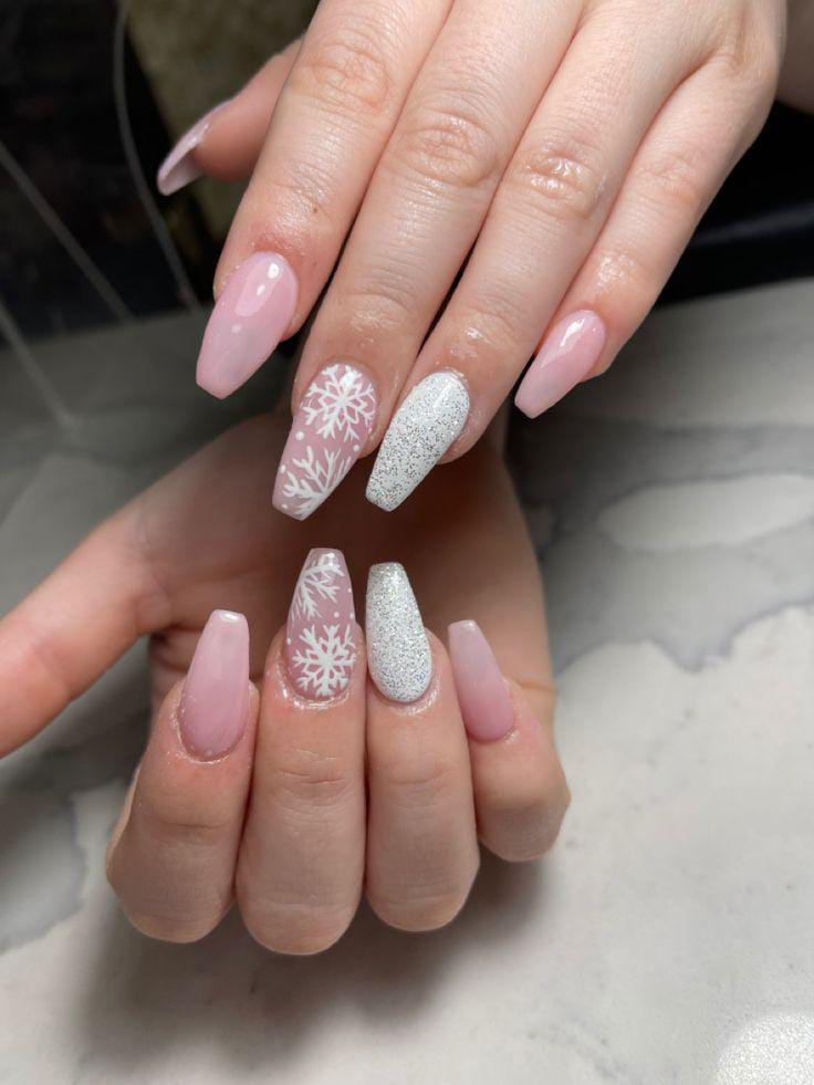 A gentle pink-to-white ombre base is topped with soft shimmer and simple white snowflakes, creating a delicate and feminine winter style. It’s subtle, pretty, and perfect for a softer seasonal look.