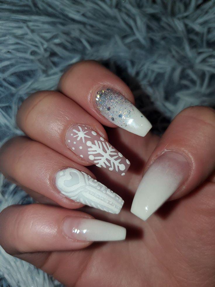 A snowy white ombré combined with glitter, snowflakes, and a knitted-sweater textured accent nail gives this set a warm, wintry vibe. It blends soft neutrals with playful winter patterns.