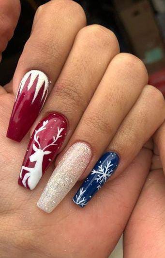 Deep red and rich blue nails decorated with a reindeer silhouette, snowflakes, and shimmering champagne glitter create a bold, festive winter holiday look. The colors feel classic and cheerful.