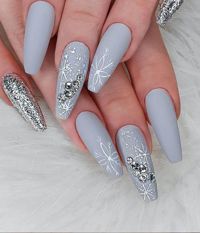 These matte grey coffin nails feature fine white snowflake details and sparkling silver accents for a sleek, wintery aesthetic. Rhinestones and glitter add an elegant icy shimmer.