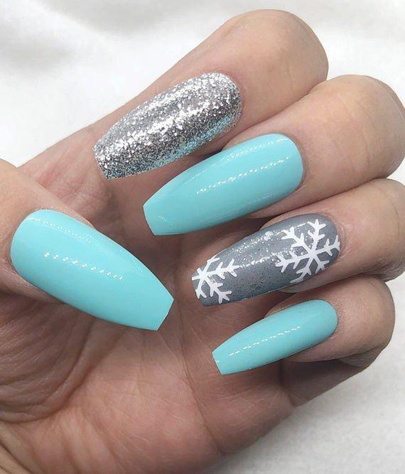 This design mixes icy mint-blue nails with a silver glitter accent and soft grey nails topped with white snowflakes, giving it a cool, frosty winter feel.