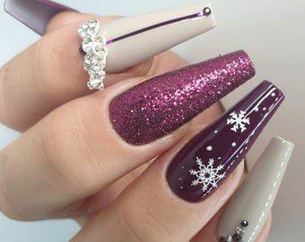 Deep plum tones blend with shimmering glitter and soft nude accents, finished with delicate white snowflakes for a cozy but glamorous winter vibe. The mix of sparkle and matte warmth feels chic and festive.