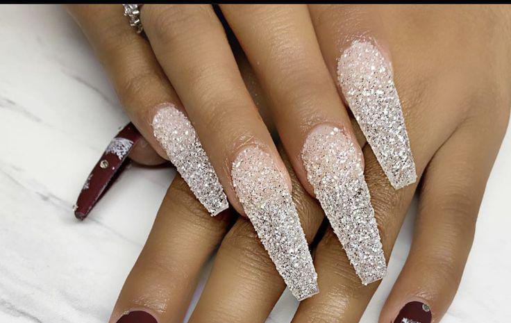 These coffin nails fade from a natural nude base into full, high-shine silver glitter, creating a sparkling, frosted-ice effect perfect for winter glam.
