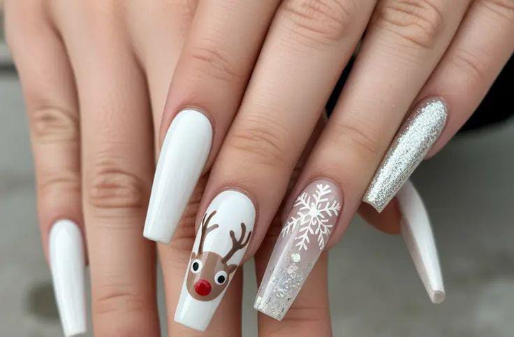 Bright white nails are paired with silver glitter and cute winter art, including a playful reindeer and crisp snowflake designs. The look is clean, cheerful, and ideal for a fun holiday-season manicure.