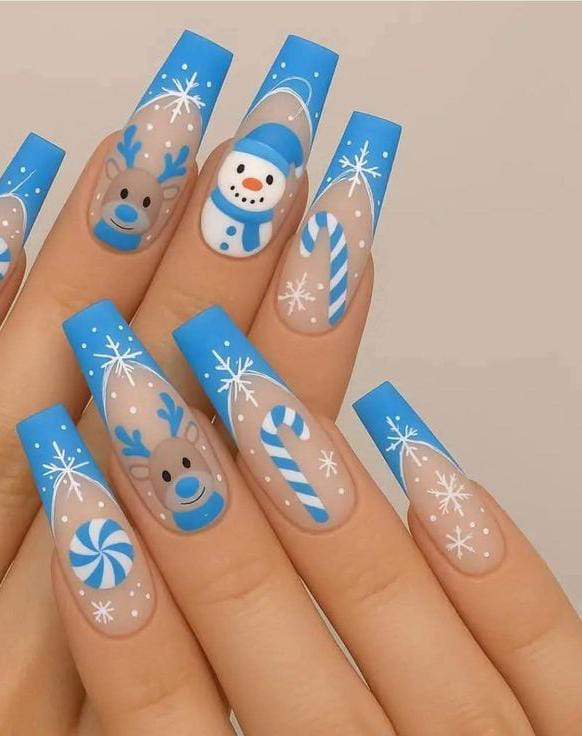 This set features playful winter icons like reindeer, candy canes, and a snowman paired with bright blue tips and white snowflake accents, giving it a cheerful holiday vibe.