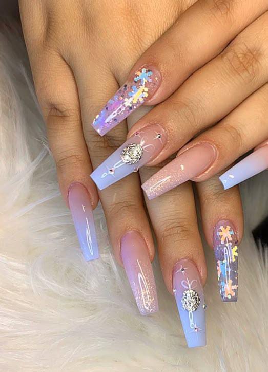 Soft pastel blues and lavenders blend with glitter, snowflake confetti, and rhinestones for a dreamy, winter look that feels elegant yet whimsical.