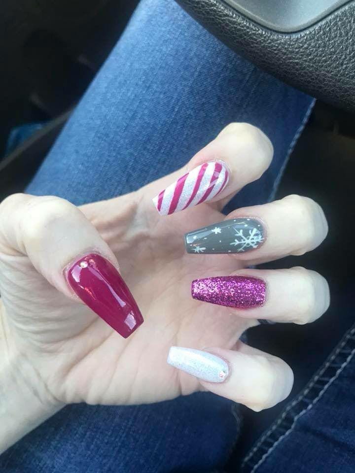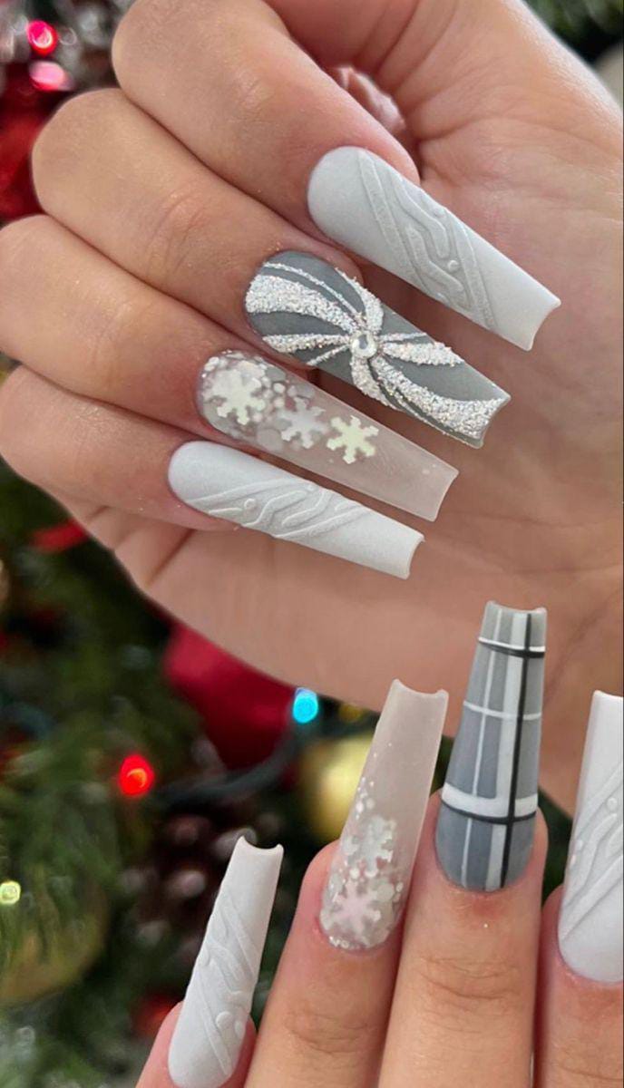 Rich berry shades, crisp white accents, and bow details are paired with glitter and snowflakes, making the nails feel like beautifully wrapped holiday presents.