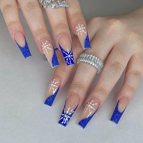 Bright cobalt-blue glitter tips contrasted with nude bases and delicate white snowflakes give this design a striking, icy winter feel.