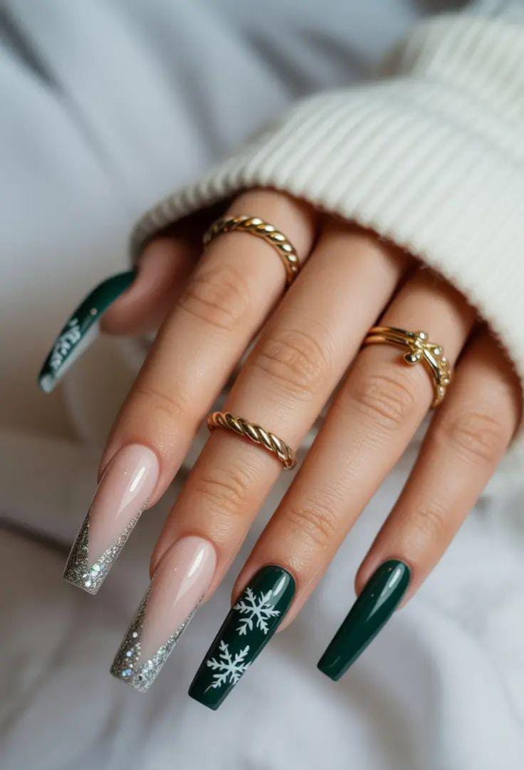 This design mixes deep emerald green with soft nude tones, accented by silver glitter tips and delicate white snowflakes for a cozy winter-chic look. It feels festive yet classy, perfect for a holiday-season manicure.