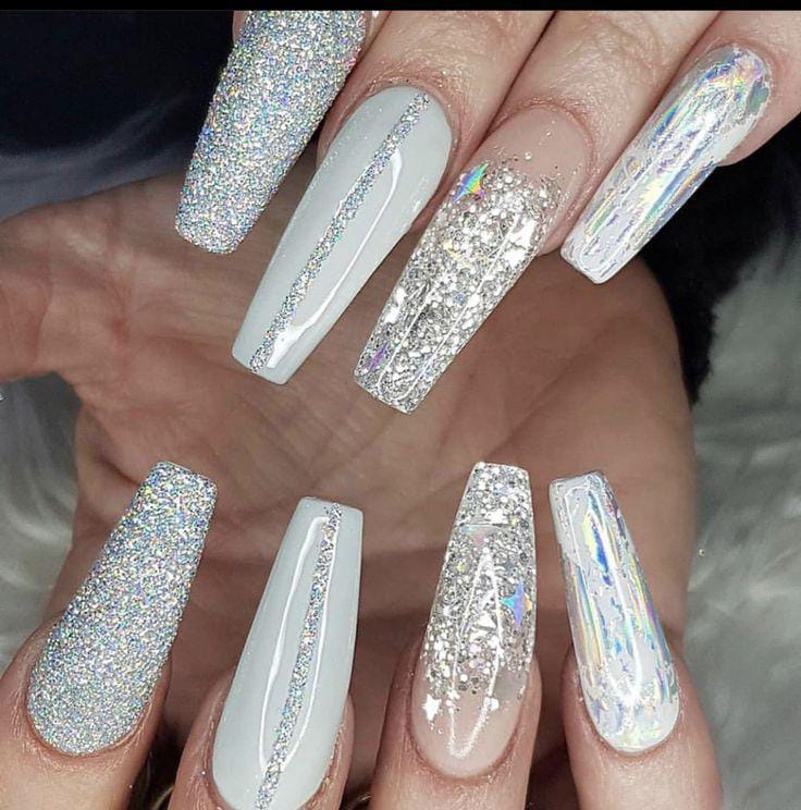 A bold blend of sparkling holographic glitter, crisp white polish, and crystal-like accents creates a dramatic icy vibe. These nails give off a high-shine, frosty winter feel that’s full of sparkle.