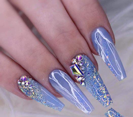 Soft periwinkle blue is paired with shimmering glitter, marble-like white veining, and gem embellishments, giving the nails a snowy, enchanted look. The mix of sparkle and texture adds a luxurious icy winter finish.