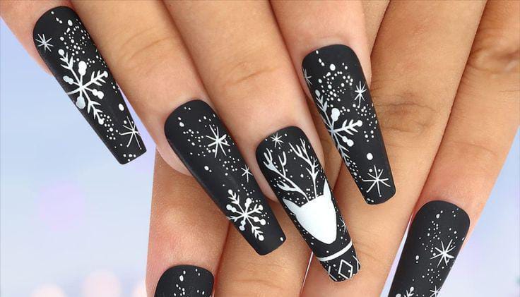 Matte black nails decorated with delicate white snowflakes, stars, and a reindeer silhouette give this set a magical, night-sky winter vibe.