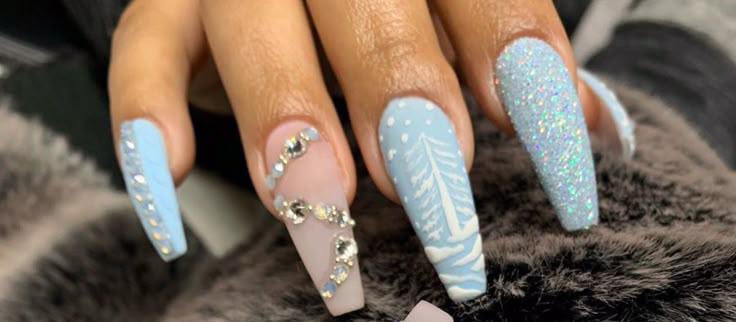 A soft icy-blue set with snowy tree art, glitter accents, and crystal placements that give the nails a cool, winter-wonderland feel. The mix of matte and sparkle adds a cozy yet glamorous touch.