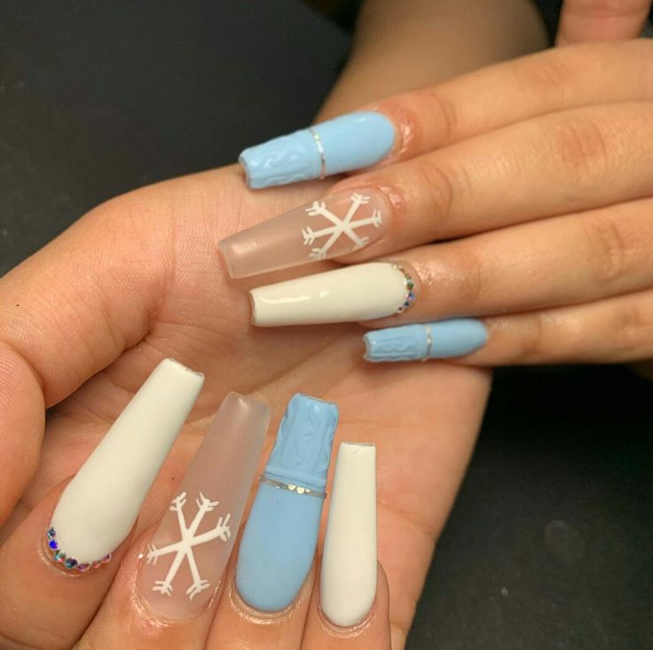Soft baby blue, crisp white, and clear nude tones come together with simple snowflake accents and sweater-texture details for a cozy winter look. The subtle rhinestone bands add just a hint of sparkle without overpowering the clean, frosty vibe.