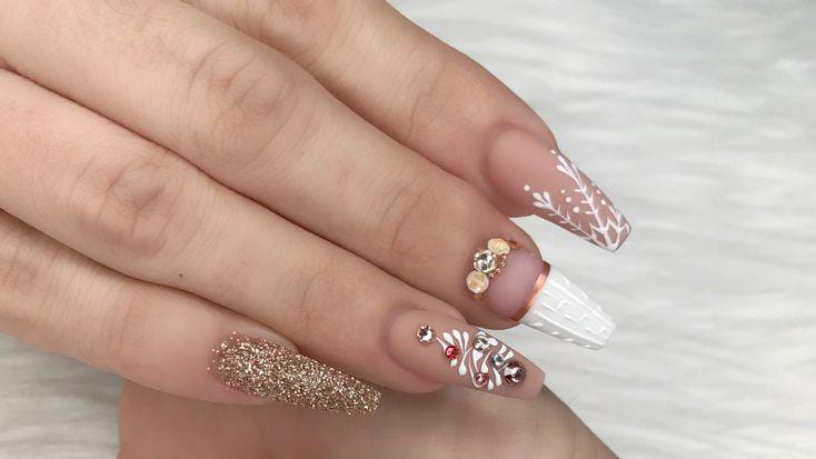 A warm nude and white combination with delicate winter patterns, gold glitter, and rhinestone accents for a soft, elegant holiday vibe. It blends cozy neutrals with just a hint of sparkle and charm.