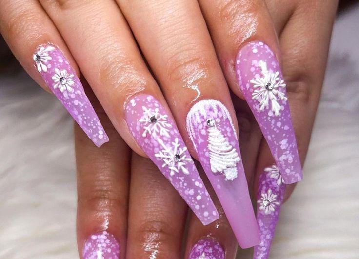 Light purple nails with white snowflakes, tiny dots, and 3D winter snowy tree that create a whimsical snowy-day aesthetic. The pastel shade gives it a dreamy, magical winter feel.