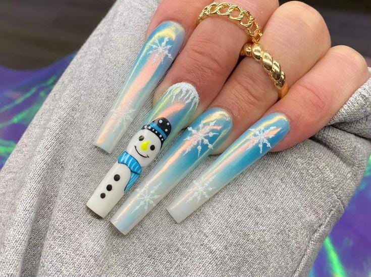 A glossy blue-to-white ombré design featuring subtle snowflakes and a cute 3D snowman as the centerpiece. The iridescent finish gives the entire set a cool, icy glow perfect for winter.