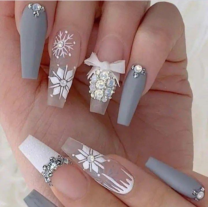 This set mixes soft gray with clear accents, delicate white snowflakes, and sparkly rhinestones for a frosty, elegant winter look. The mix of matte and glossy textures adds a chic, icy vibe.