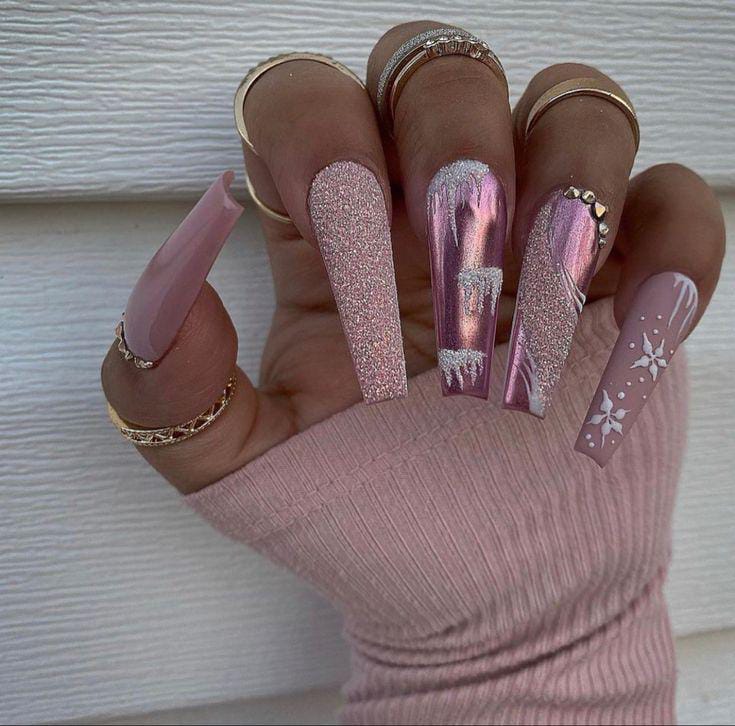 Shimmering pink metallic polish, frosted glitter, and white icicle details give this set a magical, glowing winter-wonderland effect. It’s feminine, festive, and full of soft sparkle.