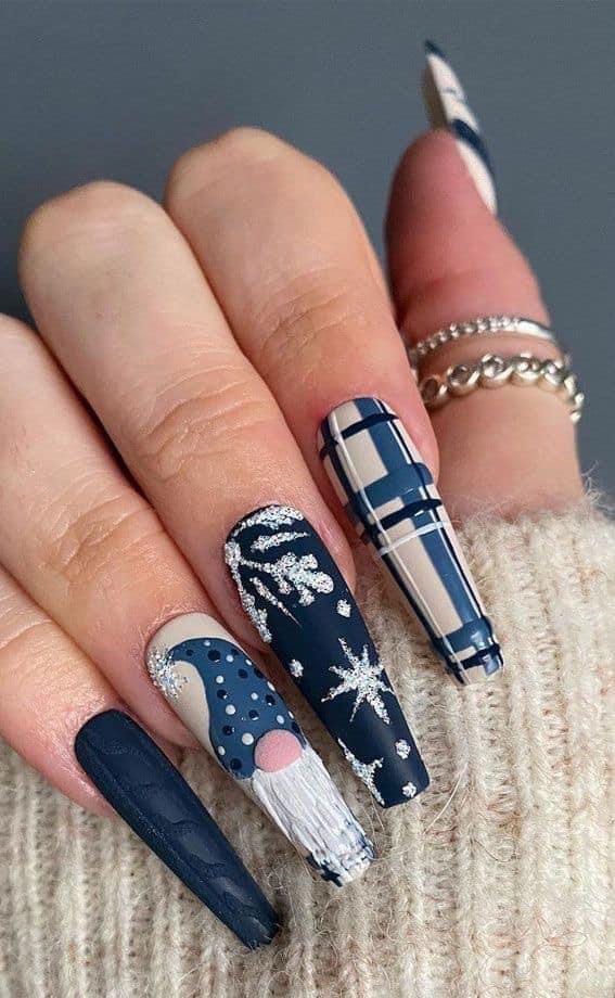Deep navy paired with cream tones, plaid accents, a gnome and glittered snowflake art creates a bold, Nordic-inspired winter look. The mix of patterns gives it a cozy, storybook-holiday vibe.